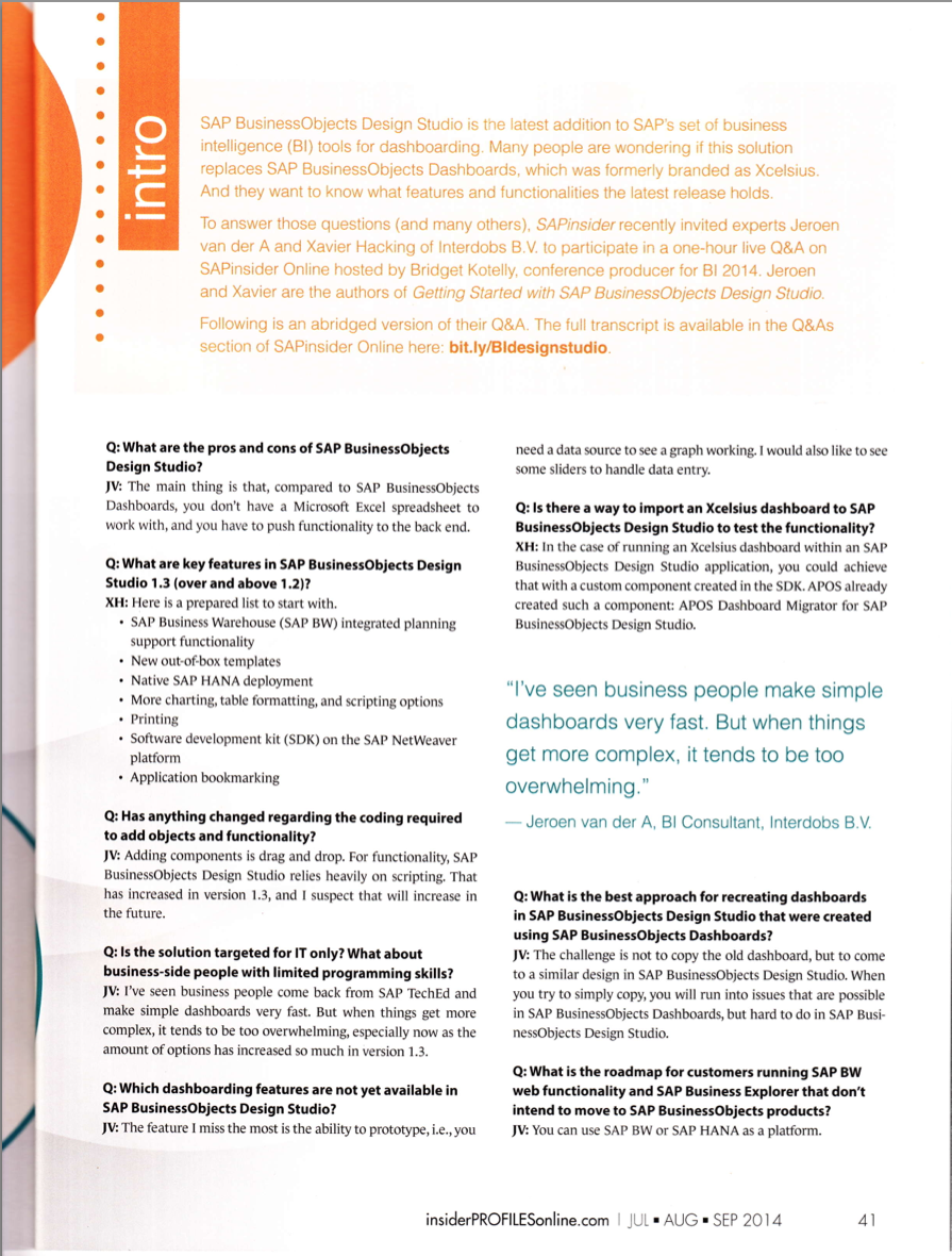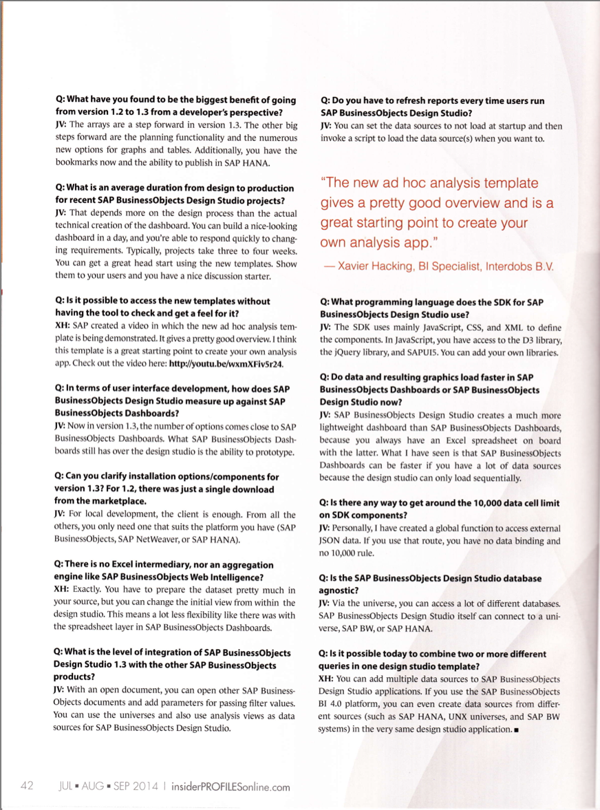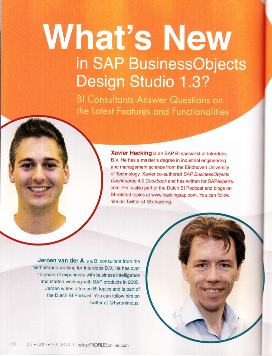 SAPinsider featured our SAP Design Studio Q&A chat we did earlier this summer in its latest edition of the InsiderProfiles paper (!) magazine. In the article a selection of questions and answers from the Q&A chat is given.