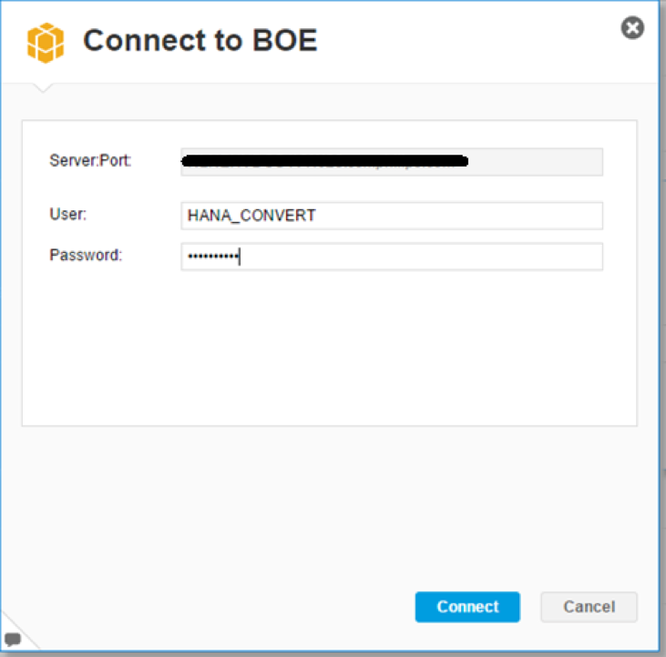 Please enter your BOE server FQDN, for instance MyBOE.server.domain. Enter a username and password and the CUID of the HANA managed connection. You can find this by viewing the properties of the connection in the CMC. Here you can copy the CUID.