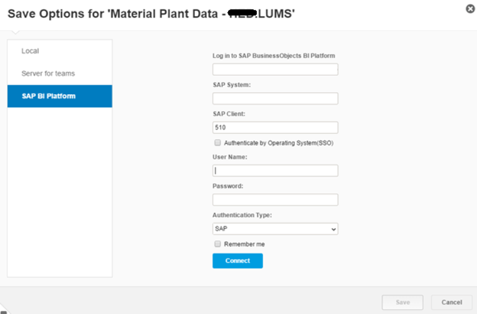 Now click on Yes and you will be prompted to connect to the SAP BusinessObjects BI platform using the enterprise credentials and click on Connect.