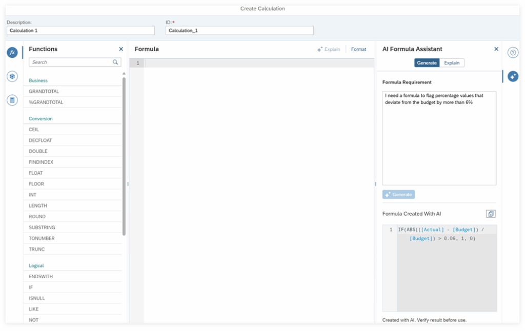 You can now have SAC generate a formula in a Data Action based on a prompt, and it can also explain a formula to you in script comments. The Data Analyzer has a similar new feature called the AI Formula Assistant that can generate formulas based on some text. In the PowerPoint add-in (yes, it’s little-known but you can link SAC objects to PPT!), SAC can write a summary of a chart. Lastly, SAC can now summarize and translate (data point) comments.